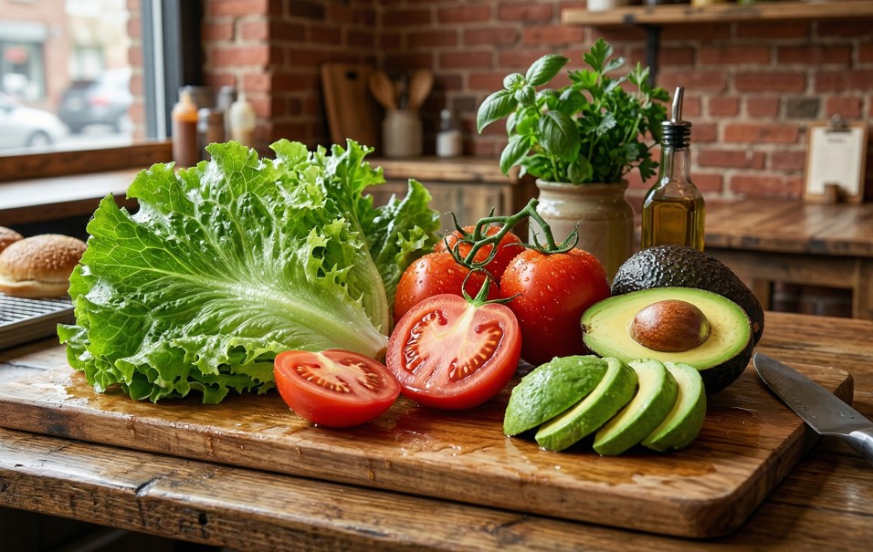 肉とパンの個性をまとめ上げるのが「野菜」です。八百屋から当日の朝に届く産地直送の新鮮な野菜(シャキシャキのレタスや完熟アボカドなど)が合わさることで、最後まで胸焼けせずに美味しく食べられるバランスが完成します。